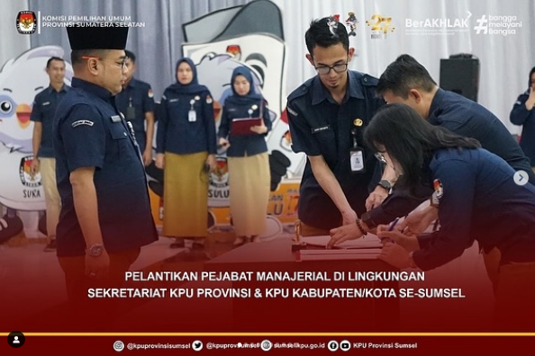 #Temanpemilih Sekretaris KPU Sumsel, Bapak Eko Iswantoro melantik 97 Pejabat Manajerial yang terdiri dari 12 Kabag dan Kasubbag KPU Provinsi serta 85 Sekretaris dan Kasubbag KPU Kab/Kota berdasarkan Keputusan Sekretaris Jenderal KPU RI Nomor 1191 Tahun 2024 tentang pemberhentian dan pengangkatan Pejabat Manajerial di lingkungan Sekretariat KPU Provinsi Sumatera Selatan, secara daring dan langsung di Aula Demokrasi KPU Sumsel, Sabtu (21/9/2024).