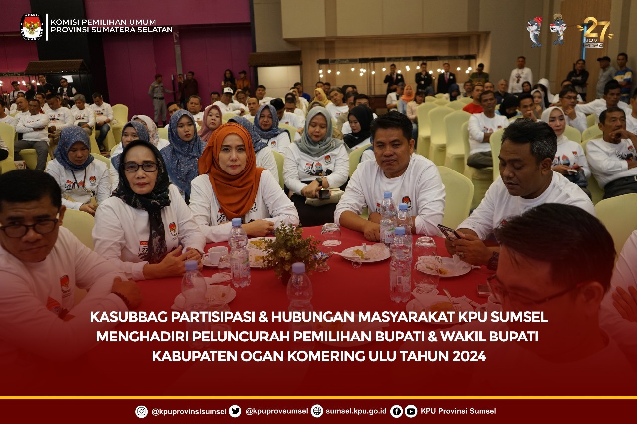 Kasubbag Partisipasi dan Hubungan Masyarakat KPU Sumsel, Ibu Herlis Miyanah menghadiri peluncuran Pemilihan Bupati dan Wakil Bupati Kabupaten Ogan Komering Ulu tahun 2024 di Hotel The Zuri Baturaja, Selasa (21/5/2024).