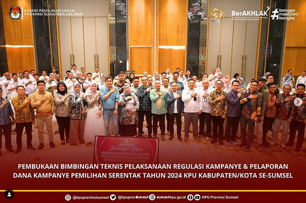 #Temanpemilih Ketua KPU Sumsel membuka bimbingan teknis regulasi kampanye dan pelaporan dana kampanye Pemilihan serentak tahun 2024 bersama KPU Kabupaten/ Kota se-Sumsel di Hotel Santika Premiere Palembang, Senin (16/9/2024).