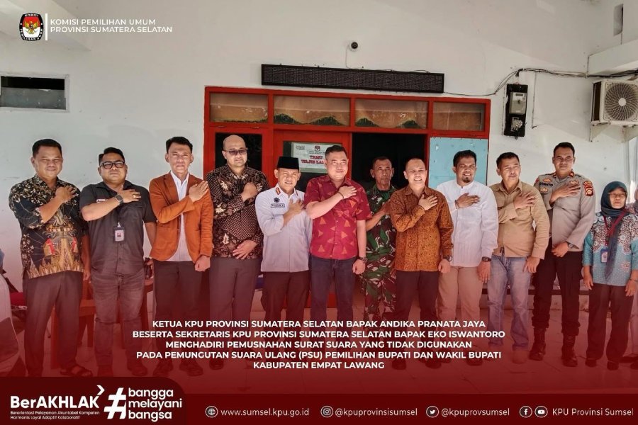 Ketua KPU Sumsel, Bapak Andika Pranata Jaya beserta Sekretaris, Bapak Eko Iswantoro menghadiri Pemusnahan Surat Suara yang tidak digunakan (kategori rusak) sebanyak 15 (lima belas) lembar Pada Pemilihan Ulang (PSU) Bupati dan Wakil Bupati Kabupaten Empat Lawang, Jum'at (18/4/2025).