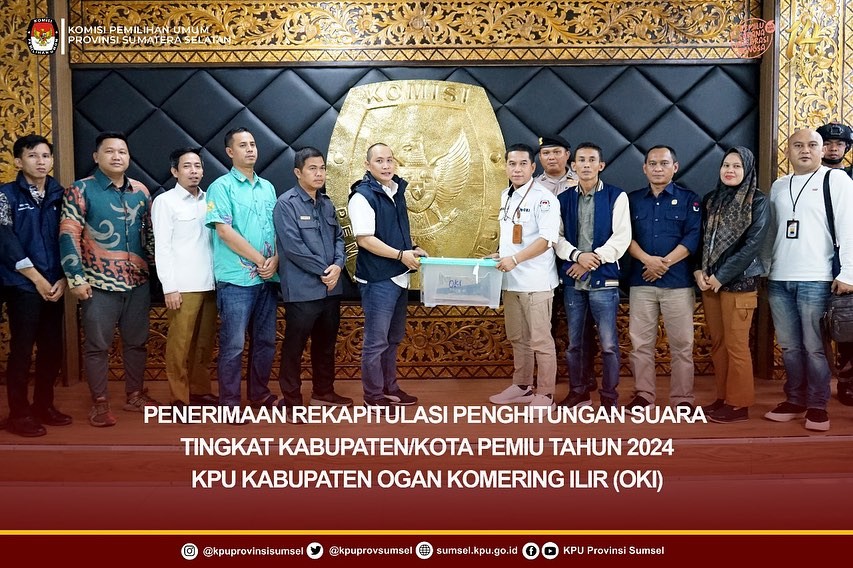 #TemanPemilih, Ketua KPU Sumsel, Bapak Andika Pranata Jaya; Anggota Divisi Hukum dan Pengawasan, Bapak Nurul Mubarok; Anggota Divisi Teknis Penyelenggaraan Pemilu, Bapak Handoko; Anggota Divisi Sosdiklih Parmas dan SDM, Bapak Rudiyanto Pangaribuan; didampingi Kabag Teknis Penyelenggaraan Pemilu dan Parhumas, Bapak Erland Evriansyah; Kabag Keuangan Umum dan Logistik, Bapak Muhammad Ridho; Kasubbag Teknis Penyelenggaraan Pemilu, Bapak Muhammad Idrus menerima dokumen rekapitulasi hasil penghitungan perolehan suara Tingkat Kabupaten/ Kota dari KPU Kabupaten Ogan Komering Ilir (OKI), Selasa (5/3/2024).