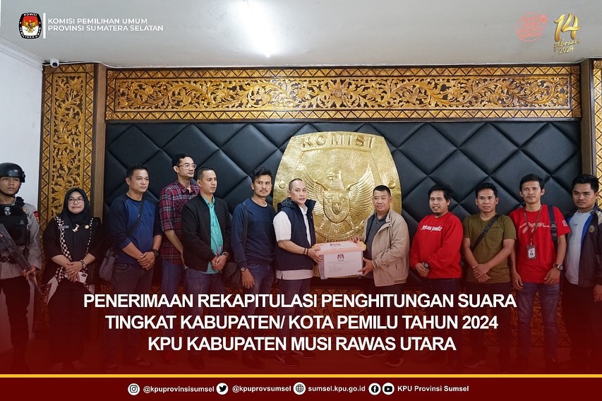 #TemanPemilih, Ketua KPU Sumsel, Bapak Andika Pranata Jaya; Anggota Divisi Perencanaan Data dan Informasi, Bapak Prahara Andri Kusuma; Anggota Divisi Teknis Penyelenggaraan Pemilu, Bapak Handoko didampingi Kabag Teknis Penyelenggaraan Pemilu dan Parhumas, Bapak Erland Evriansyah; Kabag Keuangan Umum dan Logistik, Bapak Muhammad Ridho; Kasubbag Teknis Penyelenggaraan Pemilu, Bapak Muhammad Idrus menerima dokumen rekapitulasi hasil penghitungan perolehan suara Tingkat Kabupaten/ Kota dari KPU Kabupaten Musi Rawas Utara, Senin (4/3/2024).