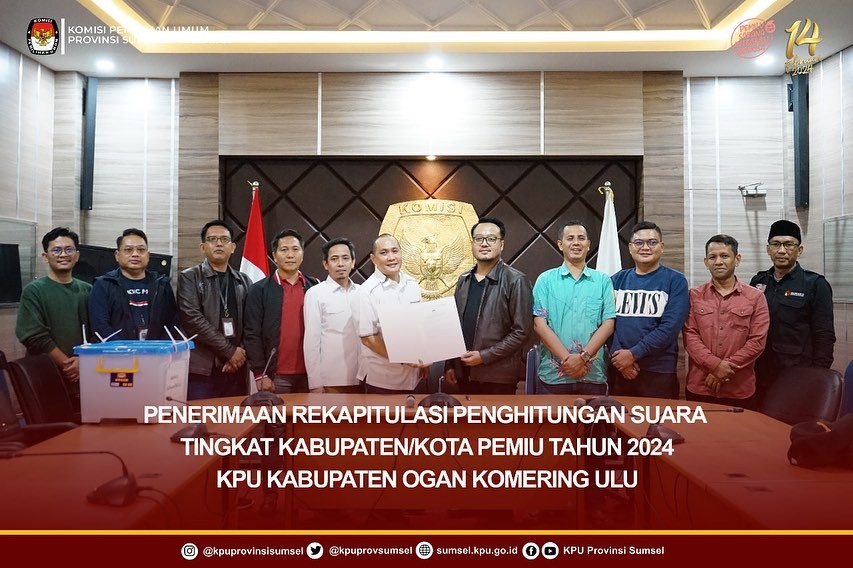 #TemanPemilih, Ketua KPU Sumsel, Bapak Andika Pranata Jaya; Anggota Divisi Hukum dan Pengawasan, Bapak Nurul Mubarok; Anggota Divisi Teknis Penyelenggaraan Pemilu, Bapak Handoko; Plt.Sekretaris, Bapak Eko Iswantoro didampingi Kabag Teknis Penyelenggaraan Pemilu dan Parhumas, Bapak Erland Evriansyah; Kabag Keuangan Umum dan Logistik, Bapak Muhammad Ridho; Kasubbag Teknis Penyelenggaraan Pemilu, Bapak Muhammad Idrus menerima dokumen rekapitulasi hasil penghitungan perolehan suara Tingkat Kabupaten/ Kota dari KPU Kabupaten Ogan Komering Ulu, Senin (4/3/2024).
