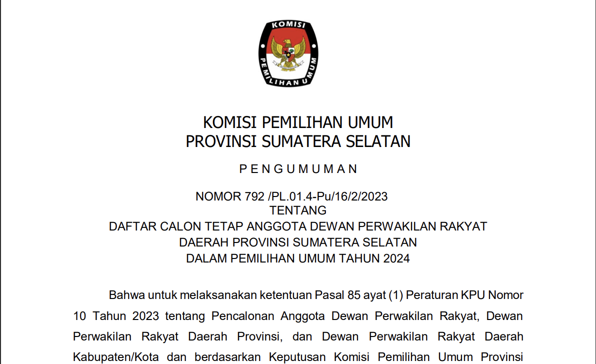 Pengumuman Daftar Calon Tetap Anggota DPRD Provinsi Sumatera Selatan untuk Pemilu Tahun 2024