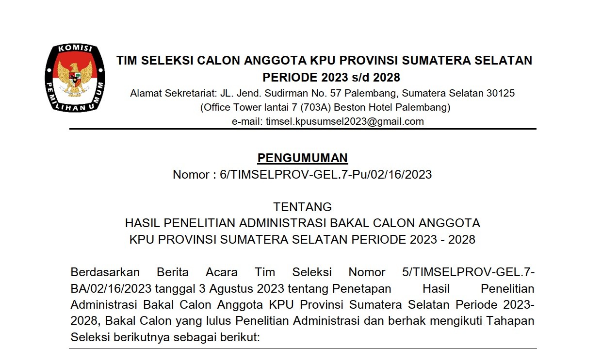 Pengumuman Hasil Penelitian Administrasi Bakal Calon Anggota KPU Provinsi Sumsel Periode 2023-2028