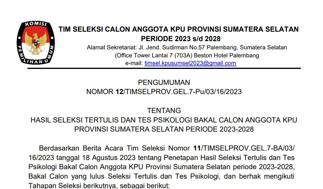 Berdasarkan Berita Acara Tim Seleksi Nomor 11/TIMSELPROV.GEL.7-BA/03/ 16/2023 tanggal 18 Agustus 2023 tentang Penetapan Hasil Seleksi Tertulis dan Tes Psikologi Bakal Calon Anggota KPU Provinsi Sumatera Selatan periode 2023-2028, Bakal Calon yang lulus Seleksi Tertulis dan Tes Psikologi, dan berhak mengikuti Tahapan Seleksi berikutnya, sebagai berikut (DONWLOAD PENGUMUMAN)