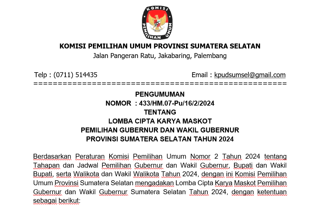 Pengumuman Lomba Cipta Karya Maskot Pemilihan Gubernur & Wakil Gubernur Sumsel Tahun 2024