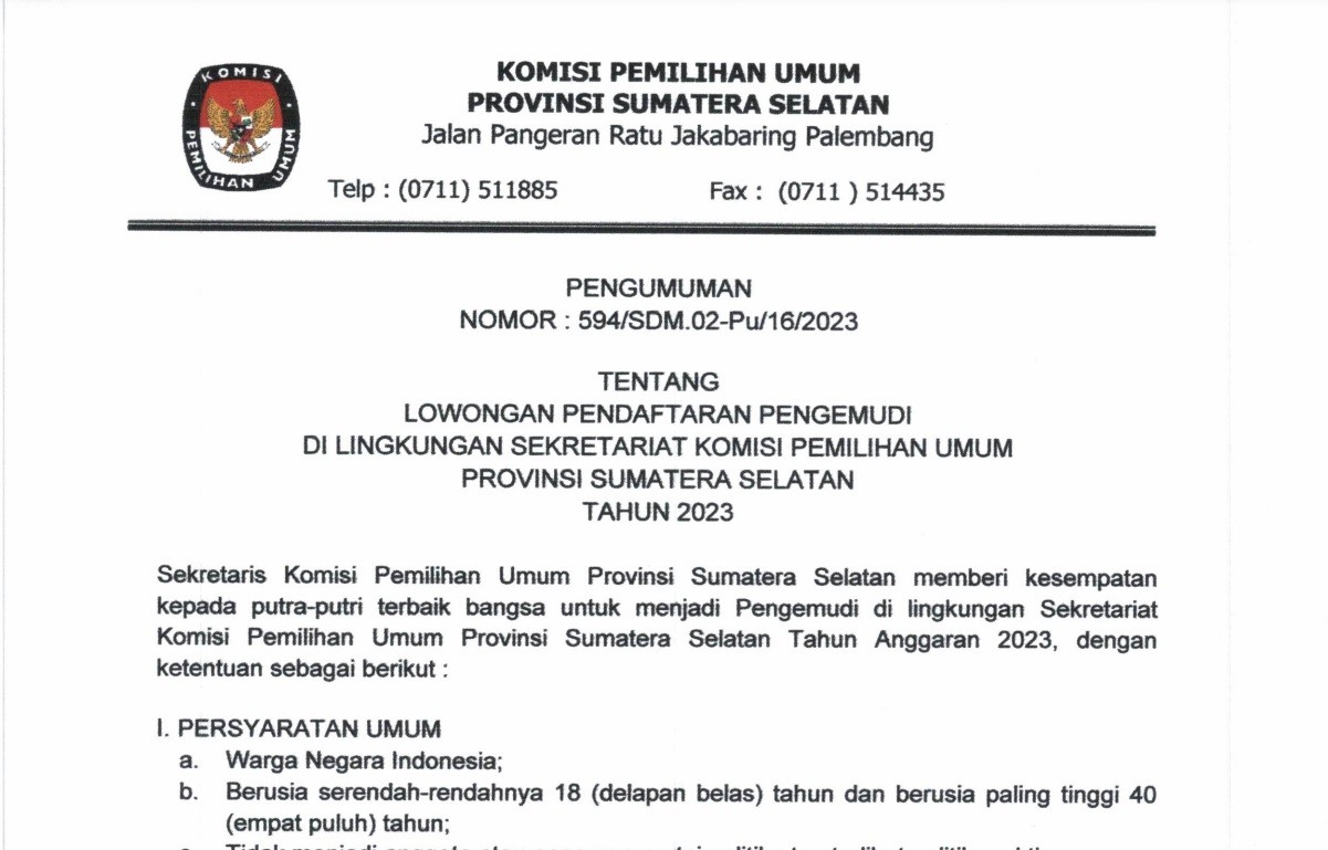 Pengumuman Lowongan Pendaftaran Pengemudi di Lingkungan Sekretariat KPU Provinsi Sumatera Selatan Tahun 2023
