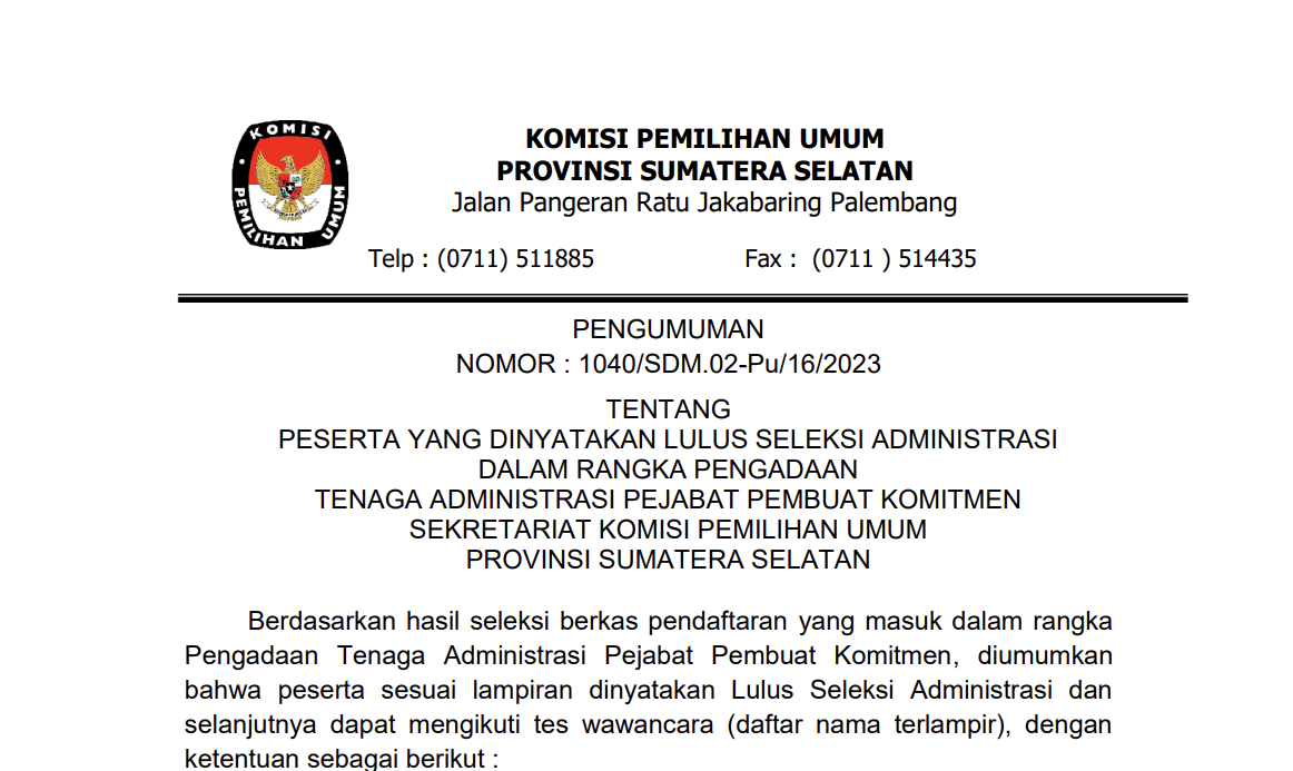 #Temanpemilih, berikut ini PENGUMUMAN NOMOR: 1040/SDM.02-Pu/16/2023 TENTANG PESERTA YANG DINYATAKAN LULUS SELEKSI ADMINISTRASI DALAM RANGKA PENGADAAN TENAGA ADMINISTRASI PEJABAT PEMBUAT KOMITMEN SEKRETARIAT KOMISI PEMILIHAN UMUM PROVINSI SUMATERA SELATAN.