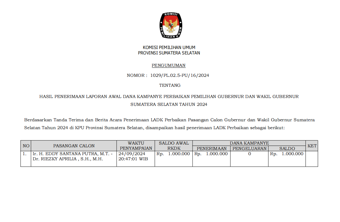 Download Pengumuman Nomor: 1029/PL.02.5-PU/16/2024 tentang Hasil Penerimaan Laporan Awal Dana Kampanye Perbaikan Pemilihan Gubernur & Wakil Gubernur Sumsel 2024