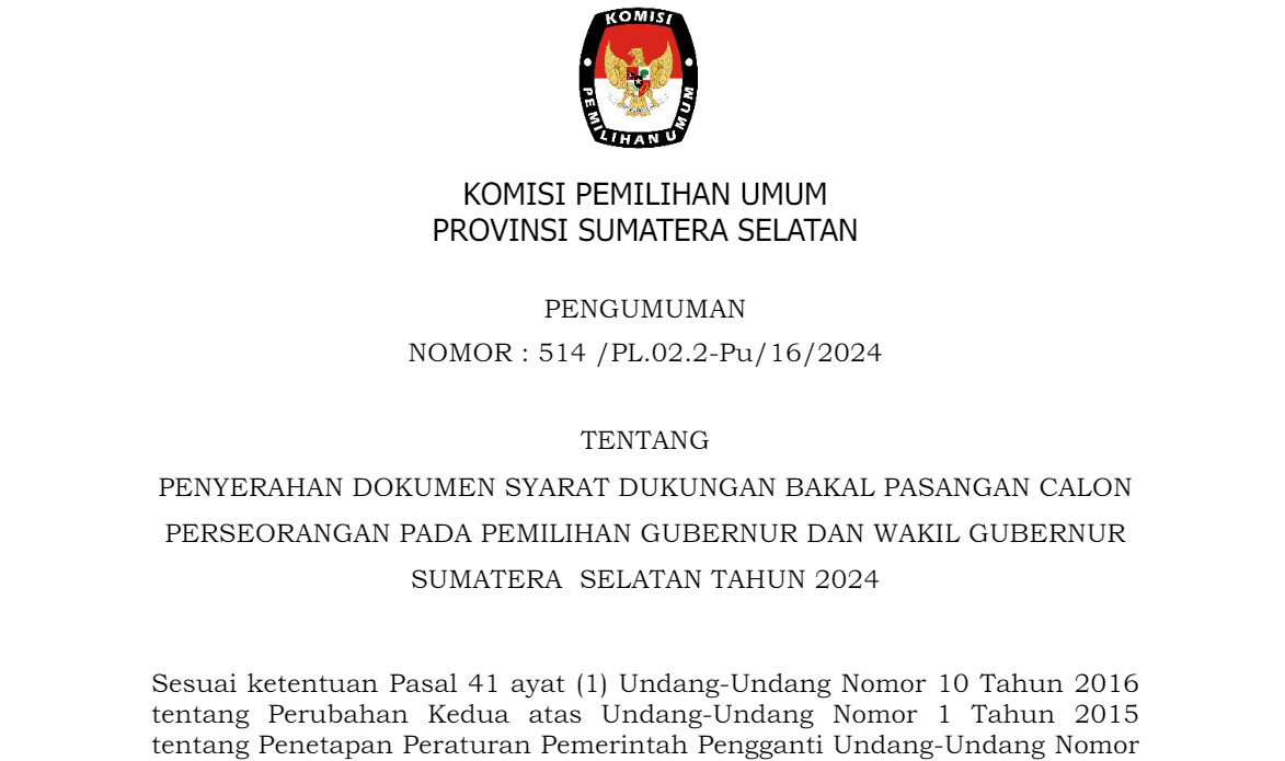 Pengumuman Penyerahan Dokumen Syarat Dukungan Bakal Paslon Perseorangan Gubernur & Wakil Gubernur Sumsel 2024