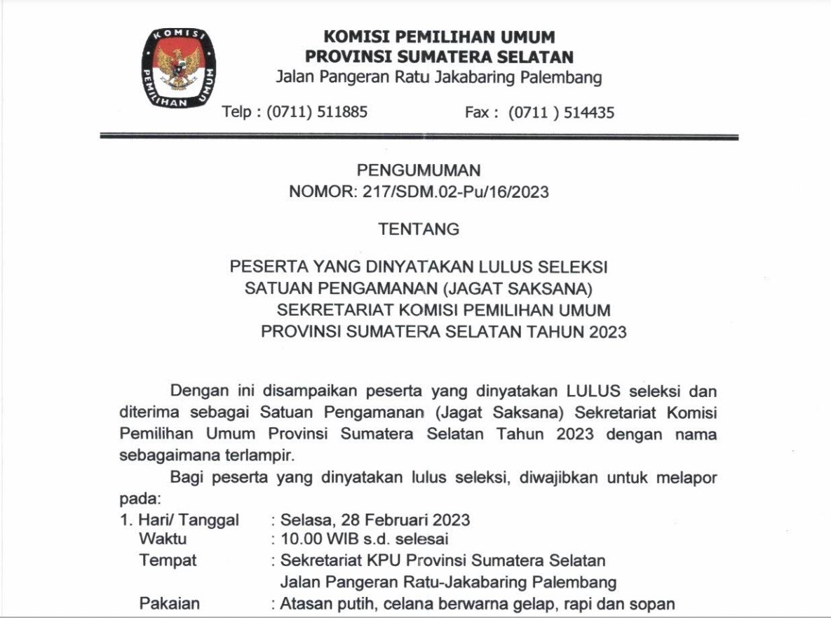 Pengumuman Peserta Lulus Seleksi Jagad Saksana Sekretariat KPU Provinsi Sumsel Tahun 2023