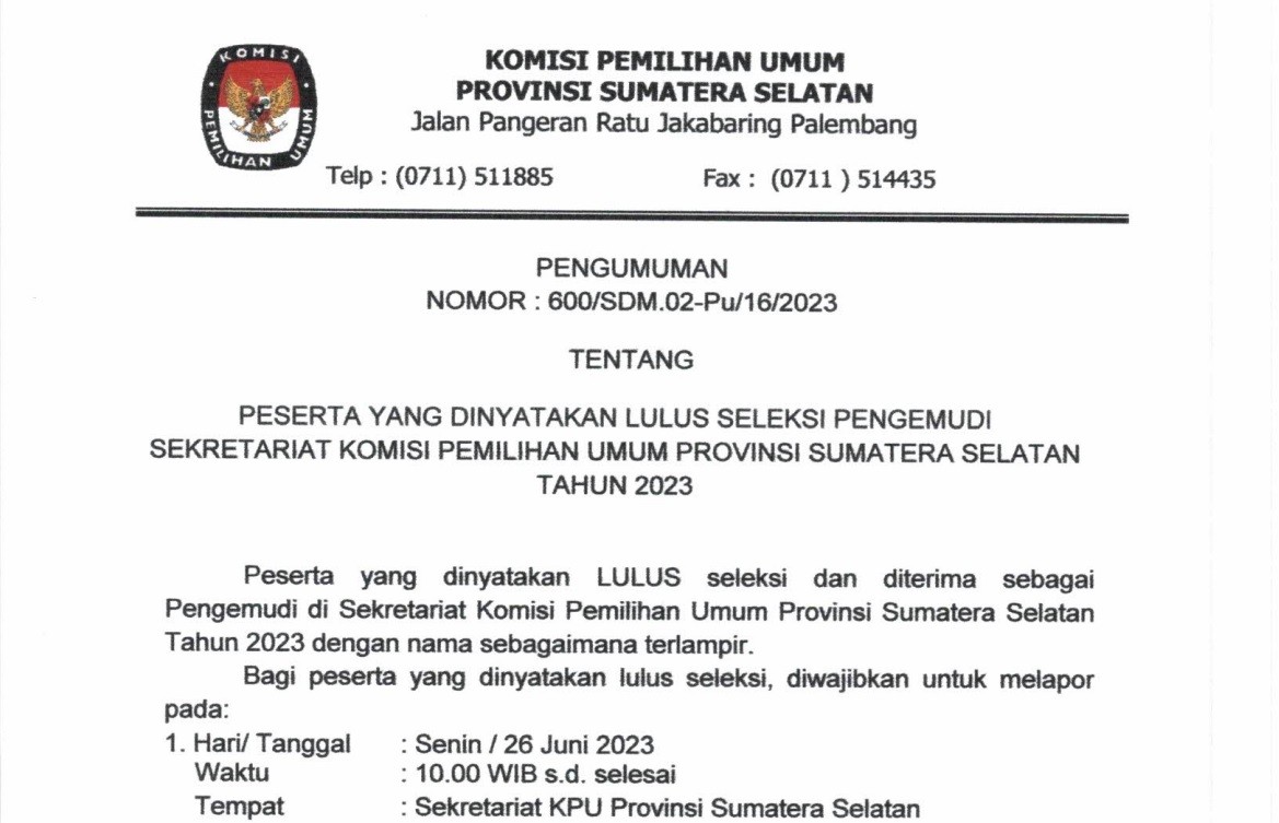 Pengumuman Peserta Lulus Seleksi Pengemudi Sekretariat KPU Provinsi Sumatera Selatan Tahun 2023