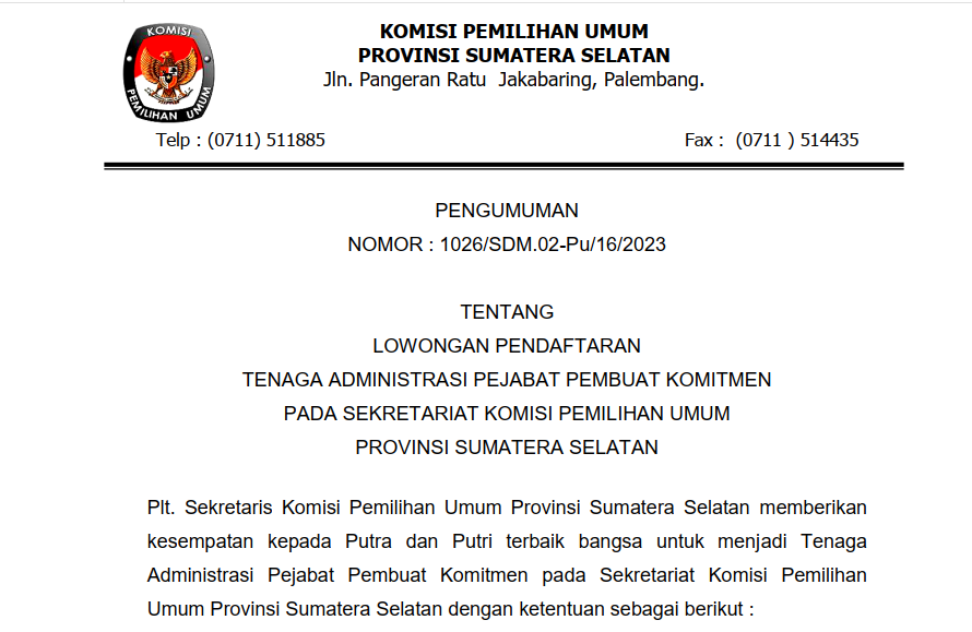 PENGUMUMAN NOMOR : 1026/SDM.02-Pu/16/2023TENTANG LOWONGAN PENDAFTARAN SELEKSI TENAGA ADMINISTRASI PEJABAT PEMBUAT KOMITMEN PADA SEKRETARIAT KOMISI PEMILIHAN UMUM PROVINSI SUMATERA SELATAN