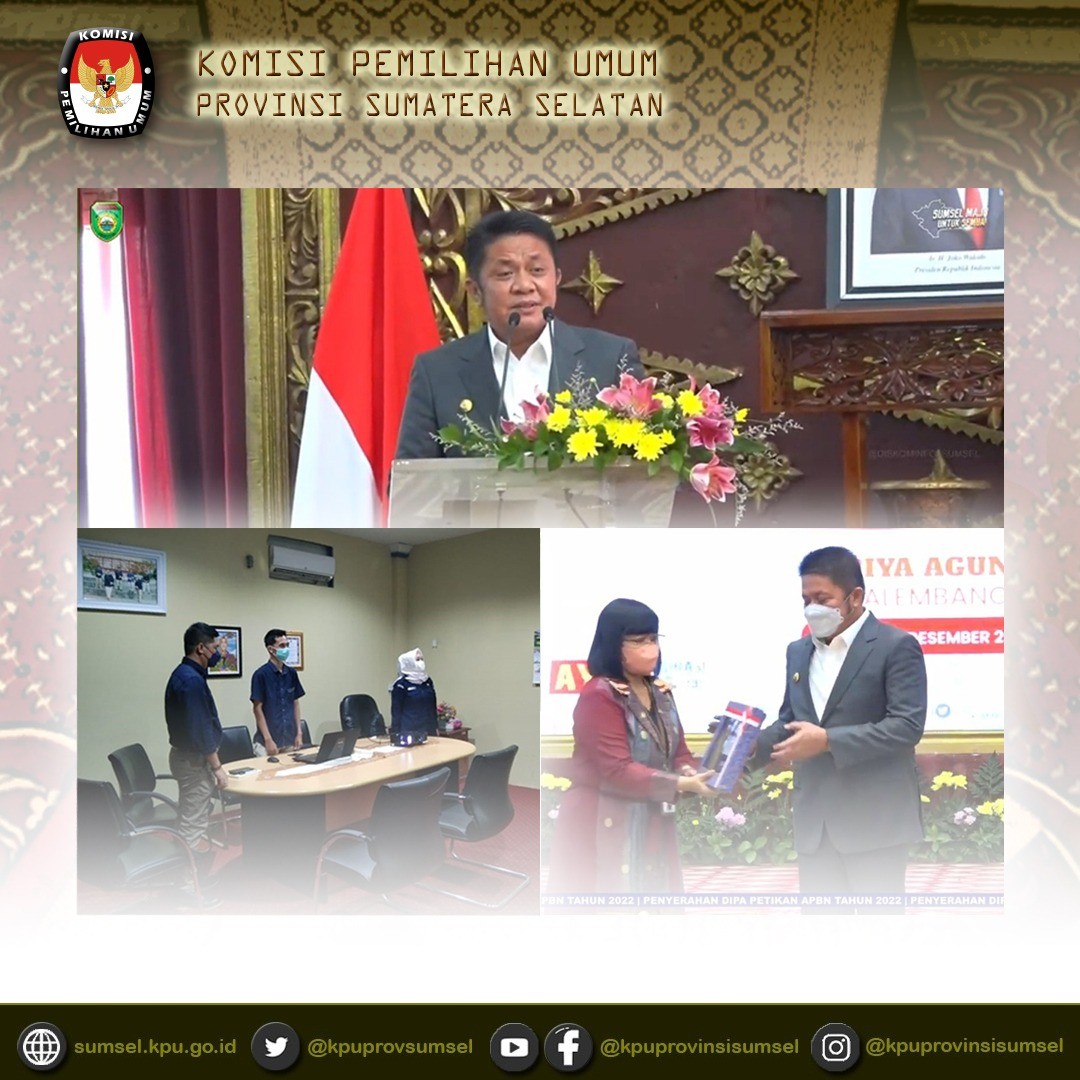 #TemanPemilih Sekretaris KPU Provinsi Sumatera Selatan di dampingi Plt. Kepala Bagian Keuangan, Umum dan Logistik Mengikuti Rapat Kegiatan Penyerahan Daftar Isian Pelaksanaan Anggaran DIPA dan Daftar Alokasi Transfer ke Daerah dan Dana Desa (DA TKDD) Tahun Anggaran 2022 yang di selenggarakan secara virtual oleh Kementerian Keuangan RI Kanwil DJPb Provinsi Sumatera Selatan diikuti oleh KPA Satker Mitra Kanwil DJPb Provinsi Sumatera Selatan.