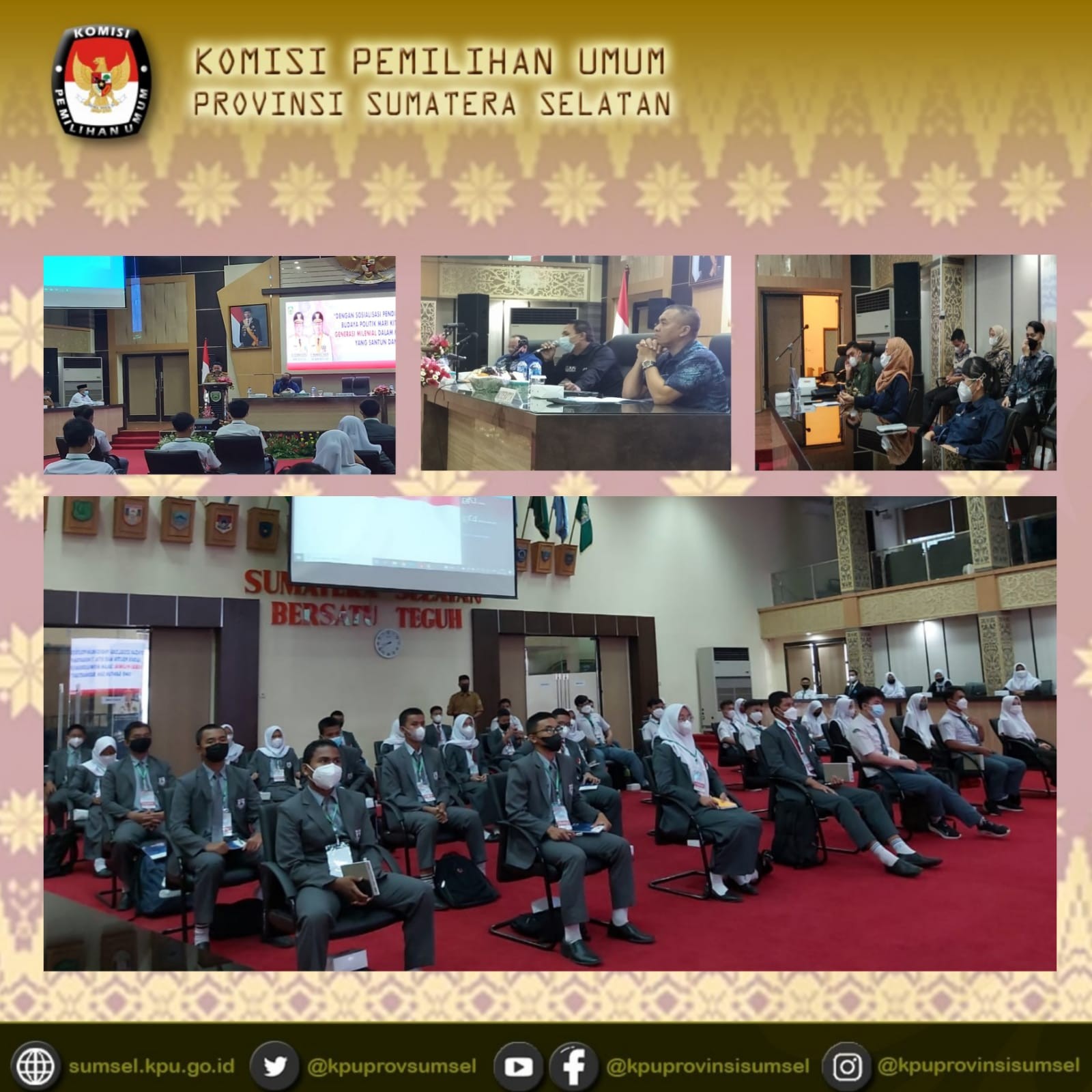 KPU Provinsi Sumatera Selatan menjadi salah satu Narasumber dalam kegiatan Sosialisasi Pendidikan Politik dan Etika Budaya Politik Tahun 2021 dengan Tema " Peran Generasi Millenial dalam Mewujudkan Demokrasi yang Santun dan Bermartabat" yang diselenggarakan oleh Badan Kesatuan Bangsa dan Politik Provinsi Sumatera Selatan.
