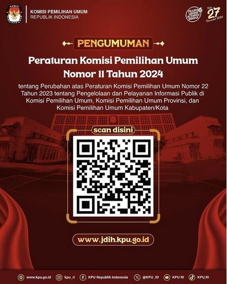 #Repost @kpu_ri #TemanPemilih, KPU telah menetapkan Peraturan KPU Nomor 11 Tahun 2024 tentang Perubahan atas Peraturan KPU Nomor 22 Tahun 2023 tentang Pengelolaan dan Pelayanan Informasi Publik di KPU, KPU Provinsi dan KPU Kabupaten/Kota.