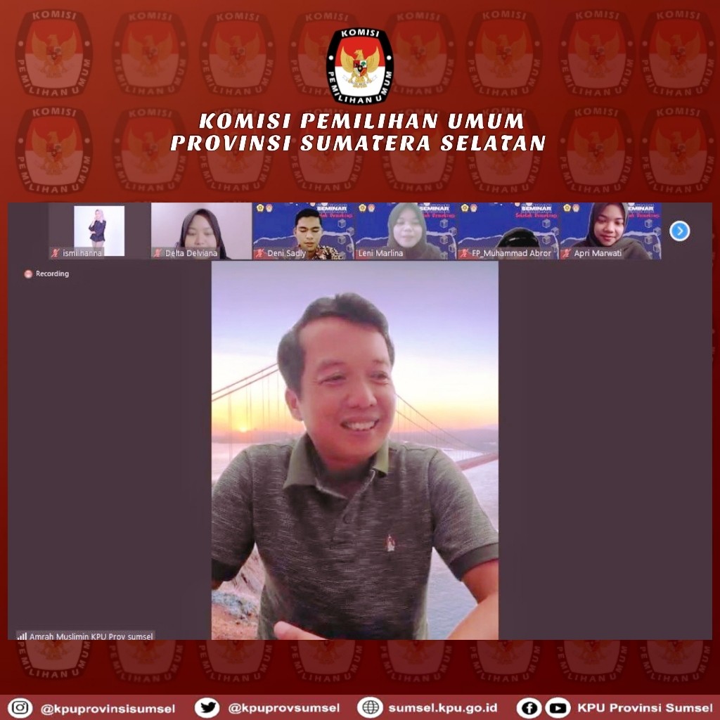 Ketua KPU Provinsi Sumatera Selatan Amrah Muslimin, menjadi narasumber dalam Webinar Sekolah Demokrasi dengan tema “ PESTA DEMOKRASI UNSRI 2021, Kita Wujudkan Mahasiswa yang Demokratis, Partisiparif, dan Cerdas dalam Memilih”.