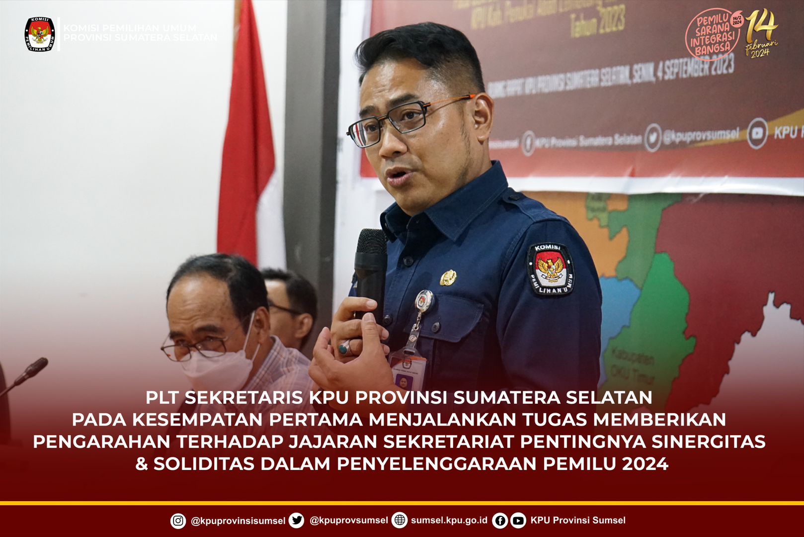 #Temanpemilih, PLT Sekretaris KPU Provinsi Sumatera Selatan, Eko Iswantoro pada kesempatan pertama menjalankan tugas memberikan pengarahan terhadap jajaran sekretariat pentingnya sinergisitas & soliditas dalam penyelenggaraan pemilu 2024