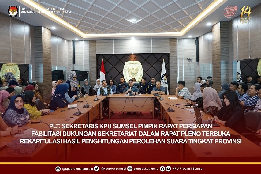 #Temanpemilih, Plt. Sekretris KPU Sumsel, Bapak Eko Iswantoro memimpin rapat persiapan bersama seluruh pejabat manajerial dan staf Sekretariat KPU Sumsel dalam rangka persiapan rapat pleno terbuka rekapitulasi hasil penghitungan perolehan suara dan penetapan hasil Pemilu 2024 tingkat Provinsi Sumatera Selatan yang akan digelar mulai tanggal 6-10 Maret 2024.