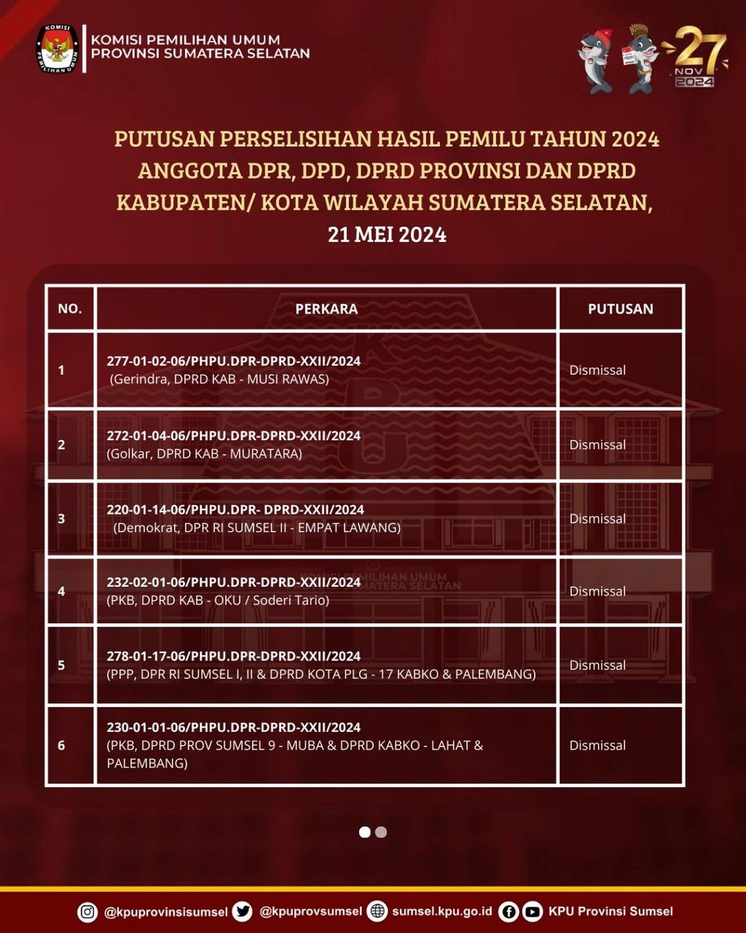 #Temanpemilih, berikut putusan perselisihan hasil Pemilu Anggota DPR, DPD, DPRD Provinsi dan DPRD Kabupaten/ Kota Pemilu tahun 2024 Wilayah Provinsi Sumatera Selatan, Selasa (21/5/2024).