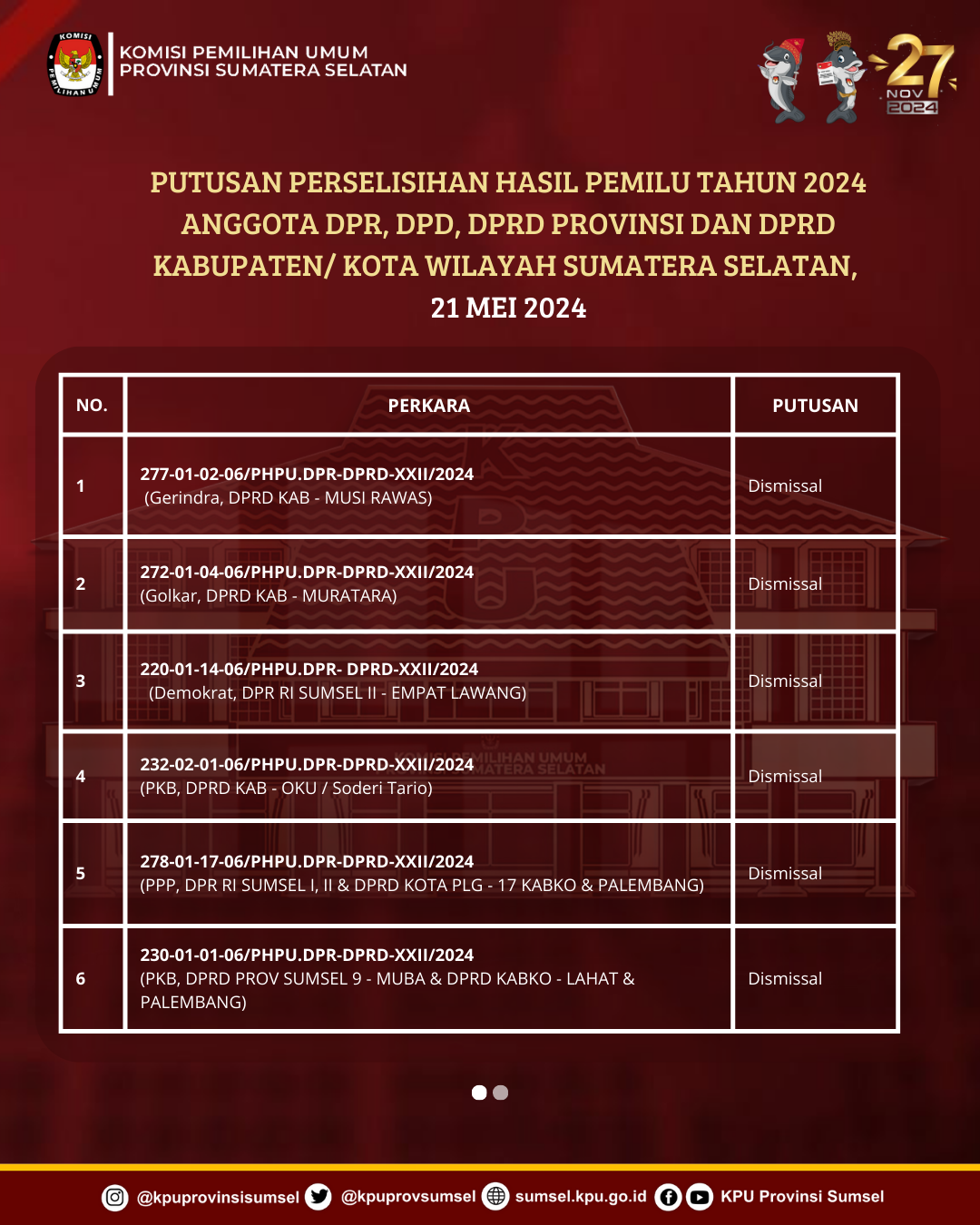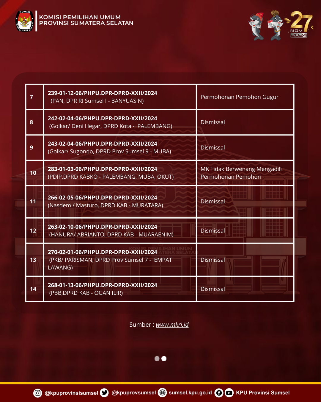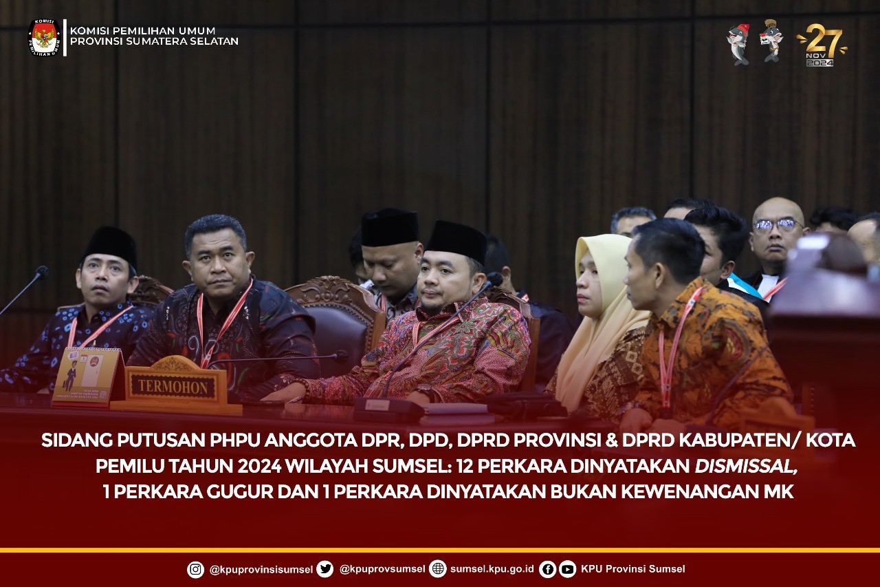 Putusan PHPU Anggota DPR, DPD, DPRD Provinsi dan DPRD Kab/Kota Wilayah Sumsel tahun 2024: 12 Perkara Dismissal, 1 Perkara Gugur & 1 Perkara Bukan Kewenangan MK