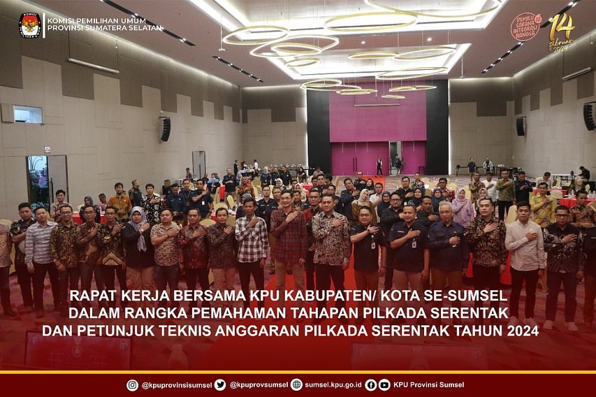 #Temanpemilih, KPU Provinsi Sumatera Selatan melaksanakan rapat kerja bersama KPU Kabupaten/Kota se-Sumsel dalam rangka pemahaman tahapan Pilkada serentak dan petunjuk teknis anggaran Pilkada serentak tahun 2024.