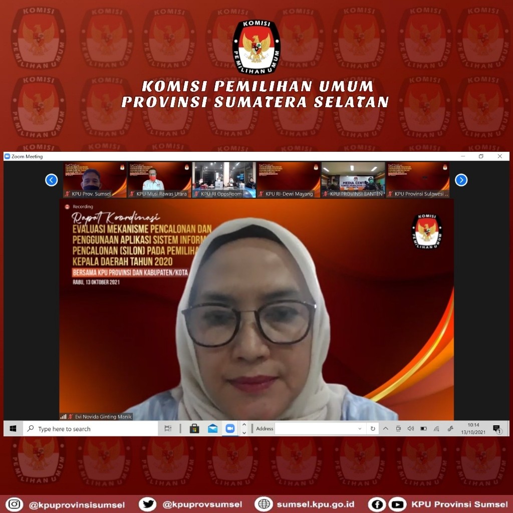 Anggota KPU Provinsi Sumatera Selatan Divisi Teknis Hendri Daya Putra mengikuti kegiatan Rapat Koordinasi Evaluasi Mekanisme Pencalonan dan Penggunaan Aplikasi Sistem Informasi Pencalonan (silon) pada Pemilihan Serentak Tahun 2020. Rapat dilaksanakan secara virtual melalui zoom meeting yang di ikuti oleh KPU Provinsi dan KPU Kabupaten se-Indonesia.