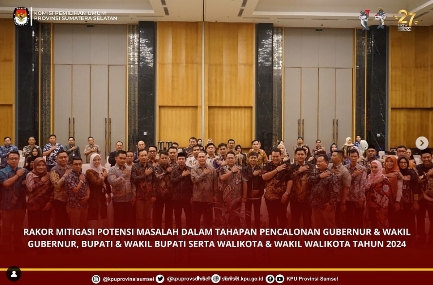 #TemanPemilih, KPU Provinsi Sumatera Selatan melaksanakan rapat koordinasi mitigasi potensi masalah dalam tahapan Pencalonan Gubernur dan Wakil Gubernur, Bupati dan Wakil Bupati serta Walikota dan Wakil Walikota tahun 2024 bersama KPU Kabupaten/Kota se-Sumatera Selatan, Sabtu (27/7/2024).