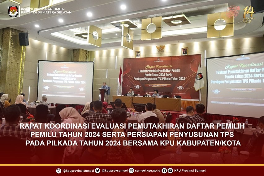 #Temanpemilih, KPU Provinsi Sumatera Selatan melaksanakan Rapat Koordinasi Evaluasi Pemutakhiran Data Pemilih Tahun 2024 serta Persiapan Penyusunan TPS Pilkada tahun 2024 bersama KPU Kabupaten/Kota se-Sumsel 3-5 April 2024.