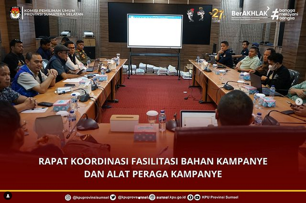 #Temanpemilih KPU Provinsi Sumatera Selatan melaksanakan rapat koordinasi fasilitasi bahan kampanye dan alat peraga kampanye Pemilihan Gubernur dan Wakil Gubernur Sumsel pada Pemilihan Serentak tahun 2024, Sabtu (28/9/2024). Dihadiri oleh Ketua dan Anggota KPU Sumsel, Bawaslu Sumsel, Kesbangpol Sumsel serta Petugas Penghubung pasangan calon peserta Pemilihan Gubernur dan Wakil Gubernur Sumsel.