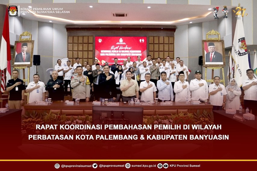 #Temanpemilih, KPU Provinsi Sumatera Selatan melaksanakan rapat koordinasi pembahasan pemilih di wilayah perbatasan Kota Palembang dan Kabupaten Banyuasin di Aula Demokrasi Kelly Mariana, Rabu (29/5/2024).