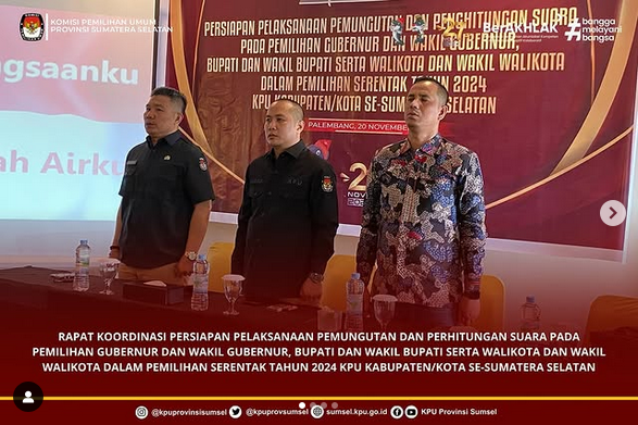 #Temanpemilih KPU Provinsi Sumatera Selatan menggelar rapat koordinasi persiapan pelaksanaan pemungutan dan penghitungan suara pada Pemilihan Gubernur dan Wakil Gubernur, Bupati dan Wakil Bupati serta Walikota dan Wakil Walikota Tahun 2024 bersama Anggota KPU Kabupaten/ Kota Divisi Teknis Penyelenggaraan Pemilu se-Sumsel di Hotel Aryaduta Palembang, Rabu (20/11/2024).