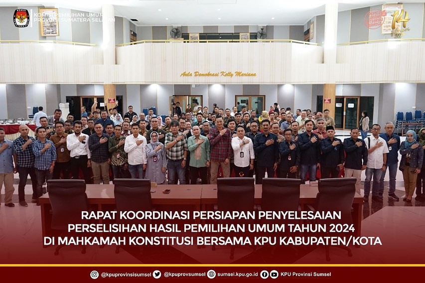 #Temanpemilih, Bertempat di Aula Demokrasi Kelly Mariana, Rabu (27/3/2024) Ketua KPU Sumsel, Bapak Andika Pranata Jaya, Anggota Divisi Perencanaan Data dan Informasi, Bapak Prahara Andri Kusuma, Divisi Sosdiklih Parmas dan SDM, Bapak Rudiyanto Pangaribuan, Plt. Sekretaris, Bapak Eko Iswantoro melaksanakan rapat koordinasi persiapan Penyelesesaian Perselisihan Hasil Pemilu (PHPU) Pemilu tahun 2024 di Mahkamah Konstitusi bersama KPU Kabupaten/Kota se-Sumsel.