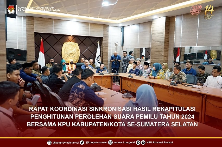 #Temanpemilih, KPU Provinsi Sumatera Selatan melaksanakan rapat koordinasi sinkronisasi rekapitulasi hasil penghitungan suara Pemilu tahun 2024 bersama KPU Kabupaten/Kota se-Sumsel di ruang rapat KPU Sumsel, Selasa (5/3/2024).