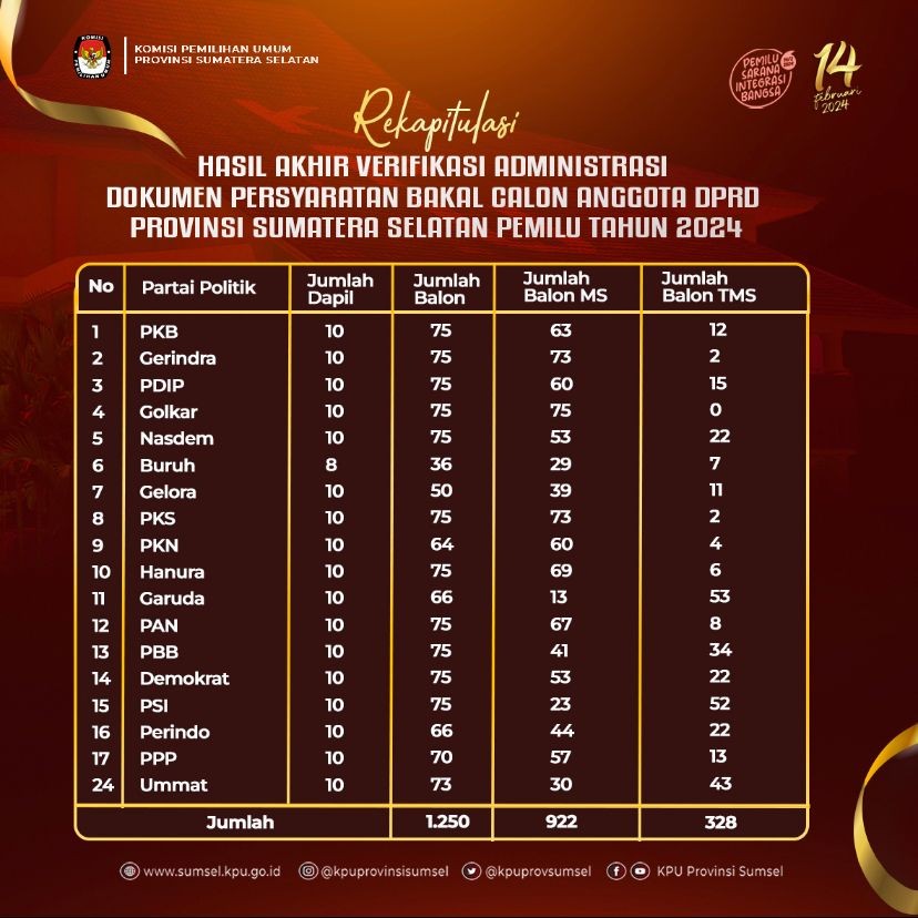 #Temanpemilih, berikut infografis rekapitulasi hasil akhir verifikasi administrasi dokumen persyaratan Bakal Calon Anggota DPRD Provinsi Sumatera Selatan Pemilu Tahun 2024.