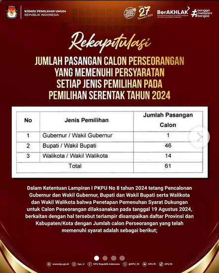 #Repost @kpu_ri #TemanPemilih, inilah Rekapitulasi Jumlah Pasangan Calon Perseorangan yang telah memenuhi persyaratan pada Pilkada Serentak Tahun 2024.