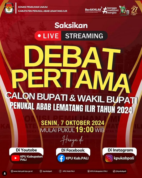 #TemanPemilih, Yuk Saksikan Live streaming Debat Pertama Calon Bupati dan Wakil Bupati Penukal Abab Lematang Ilir Tahun 2024.