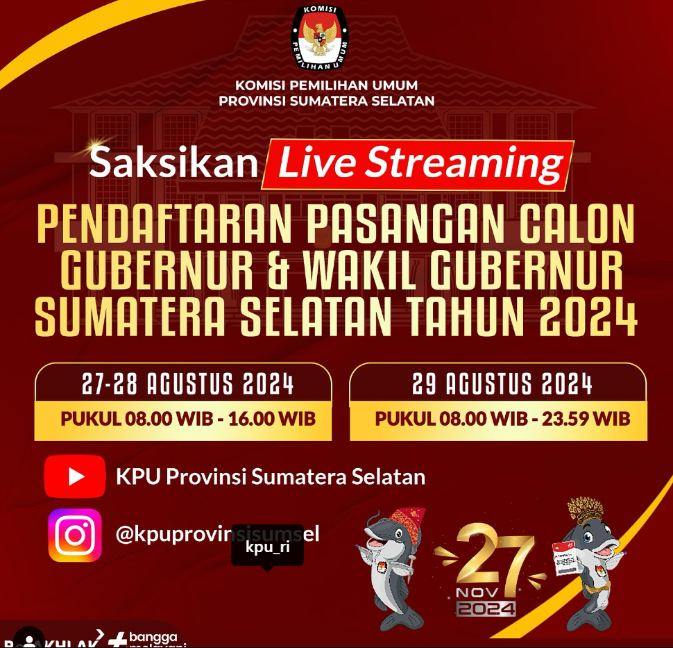 Saksikan Live Streaming Penedaftaran Pasangan Calon Gubernur & Wakil Gubernur Sumatera Selatan Tahun 2024