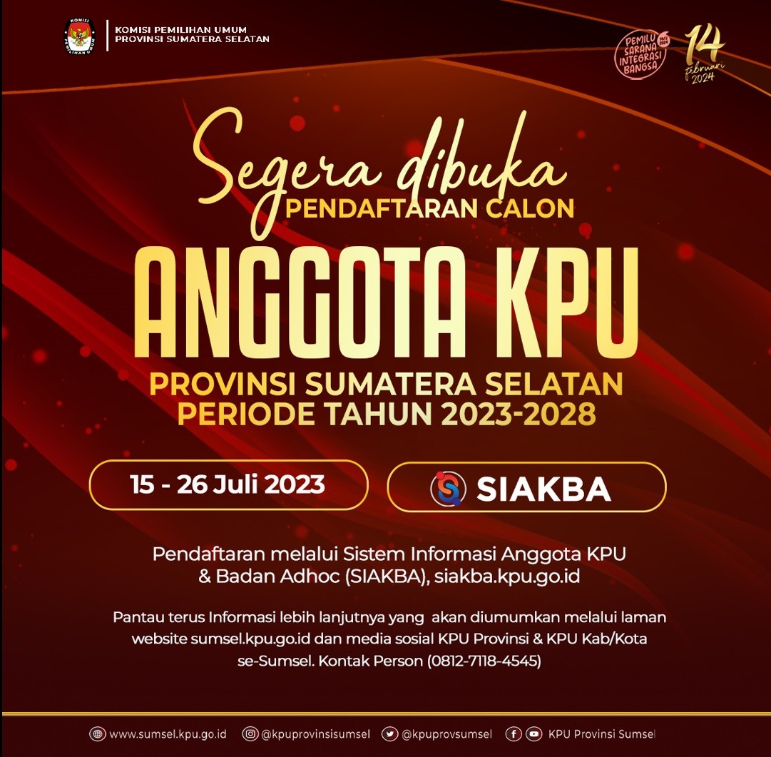 Pantau terus Laman website sumsel.kpu.go.id serta semua kanal media sosial KPU Provinsi Sumatera Selatan untuk Informasi terupdate mengenai rekrutmen Anggota KPU Sumsel.