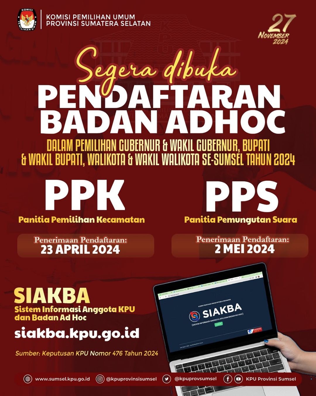 #Temanpemilih, segera dibuka pendaftaran Panitia Pemilihan Kecamatan dalam Pemilihan Gubernur dan Wakil Gubernur, Bupati dan Wakil Bupati, Walikota dan Wakil Walikota Provinsi Sumatera Selatan tahun 2024