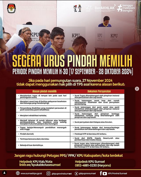 Kamu dapat segera mengurus pindah memilih mulai 17 September sampai dengan 28 Oktober 2024 ke PPS setempat.