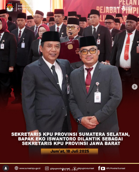#Temanpemilih Sekretaris KPU Provinsi Sumatera Selatan, Bapak Eko Iswantoro, S.STP., M.M dilantik dan diambil sumpah sebagai Sekretaris KPU Provinsi Jawa Barat oleh Sekretaris Jenderal KPU RI, Bapak Bernad Dermawan Sutrisno di Jambi, Jum'at (18/7/2025).
