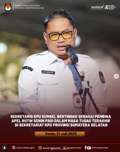 #Temanpemilih Sekretaris KPU Sumsel, Bapak Eko Iswantoro, S.STP., M.M bertindak sebagai pembina apel rutin senin pagi di linkungan Sekretariat KPU Provinsi Sumatera Selatan, 21 Juli 2025.