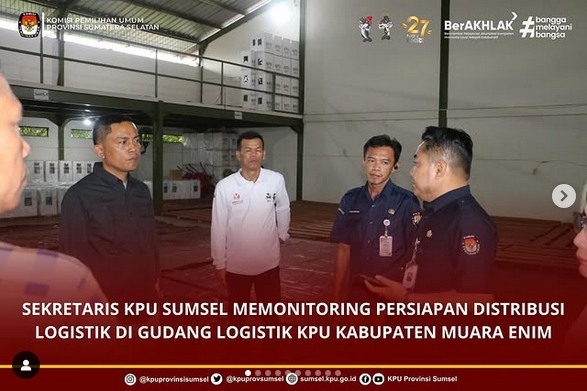 Sekretaris KPU Sumsel, Bapak Eko Iswantoro memonitoring persiapan distribusi logistik yang akan didistribusikan dari Gudang KPU Kabupaten Muara Enim menuju Kecamatan-Kecamatan, Minggu (24/11/2024).
