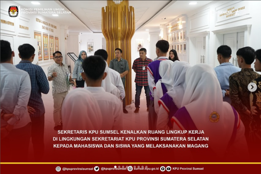 #Temanpemilih Sekretaris KPU Sumsel, Bapak Eko Iswantoro didampingi Pejabat Manajerial memperkenalkan ruang lingkup kerja, visi-misi, tugas, kewenangan dan tanggung jawab KPU Provinsi Sumatera Selatan kepada Mahasiswa dan Siswa magang, Kamis (3/7/2025).