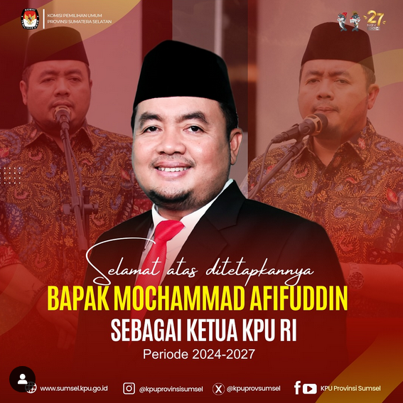 #TemanPemilih, Pleno KPU tanggal 28 Juli 2024 menetapkan Bapak Mochammad Afifuddin sebagai Ketua KPU definitif , terhitung mulai ditetapkan hingga selesai periode masa jabatan Tahun 2027. Semoga selalu sehat dan lancar dalam mengemban amanah melaksanakan tugas kepemiluan.