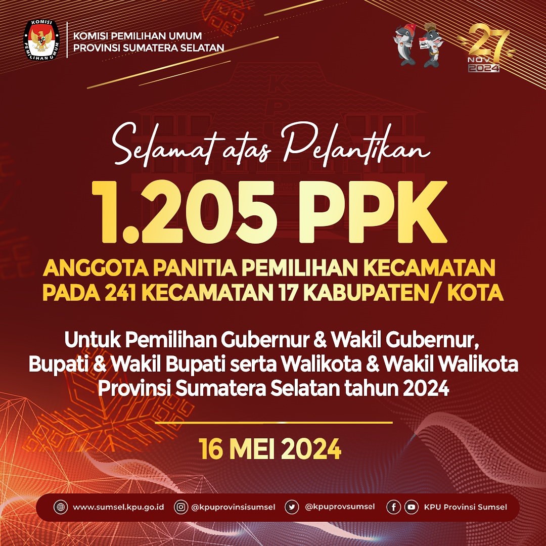 #Temanpemilih, #Temanpemilih selamat atas pelantikan 1.205 Anggota Panitia Pemilihan Kecamatan (PPK) yang tersebar di 241 Kecamatan 17 Kabupaten/Kota untuk Pemilihan Gubernur dan Wakil Gubernur, Bupati dan Wakil Bupato serta Walikota dan Wakil Walikota tahun 2024, Kamis (16/5/2024).