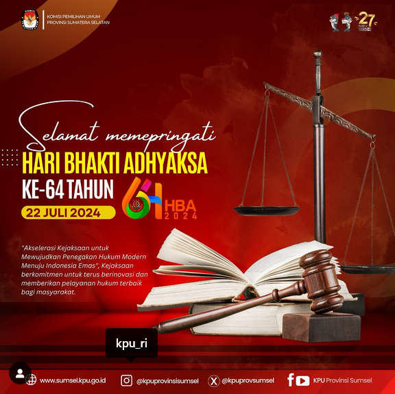 #Temanpemilih, KPU Provinsi Sumatera Selatan mengucapkan selamat memperingati hari Bhakti Adhyaksa ke-64 tahun.