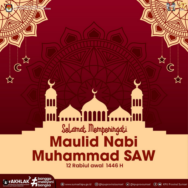 #Temanpemilih KPU Provinsi Sumatera Selatan mengucapkan selamat memperingati hari Maulid Nabi Muhammad SAW, 12 Rabiul Awal 1446 H.